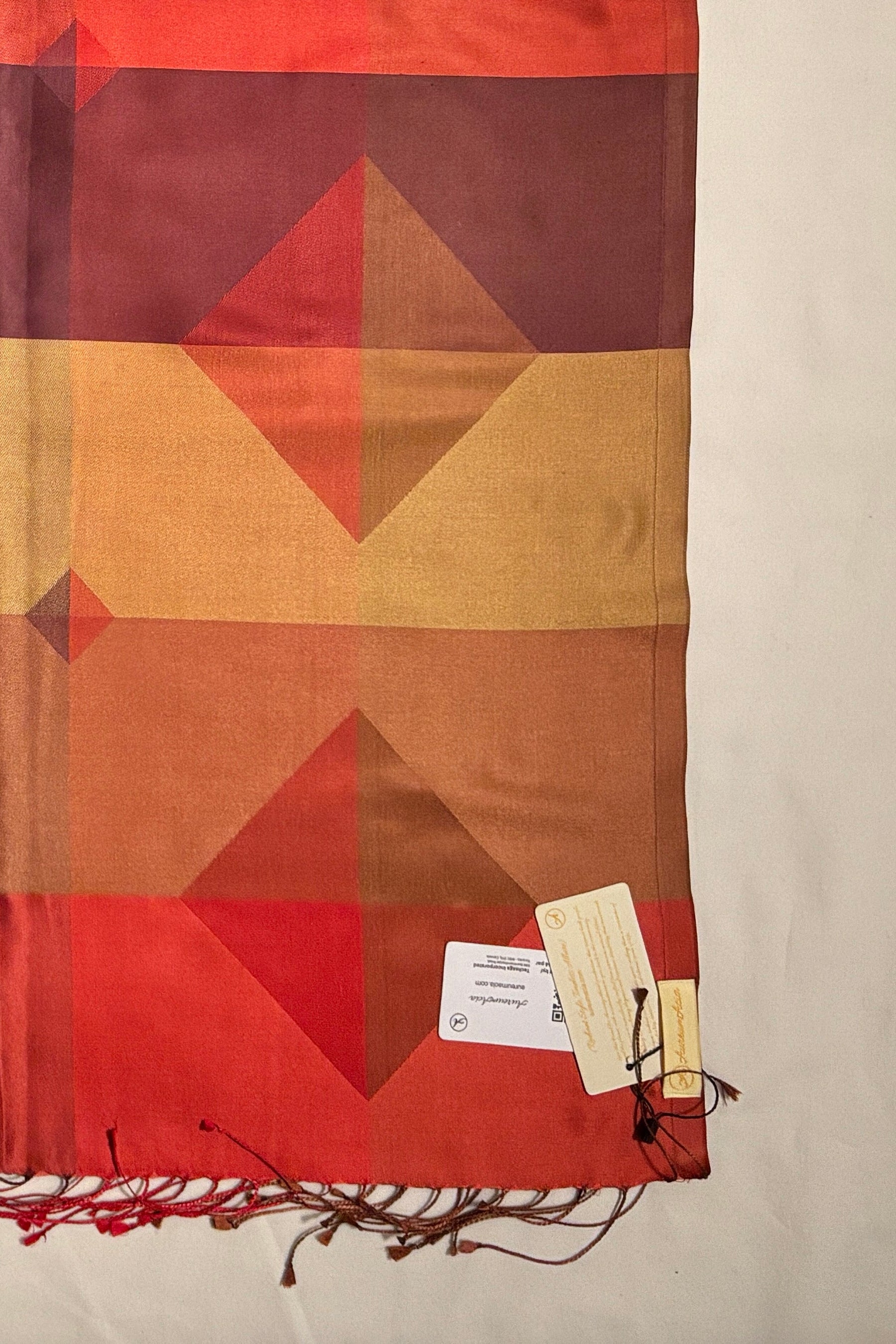 Embrace the essence of royal heritage and timeless elegance with this exquisite designer scarf, masterfully woven from 100% silk. Infused with the rich hues of deep red, imperial maroon, radiant copper, and opulent golden tones, this scarf is a celebration of cultural grandeur and artisanal finesse. Its lustrous silk fibers shimmer like liquid gold, evoking the splendour of traditional craftsmanship passed down through generations.