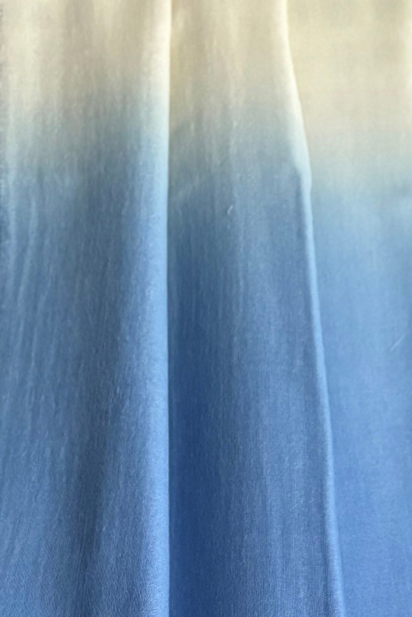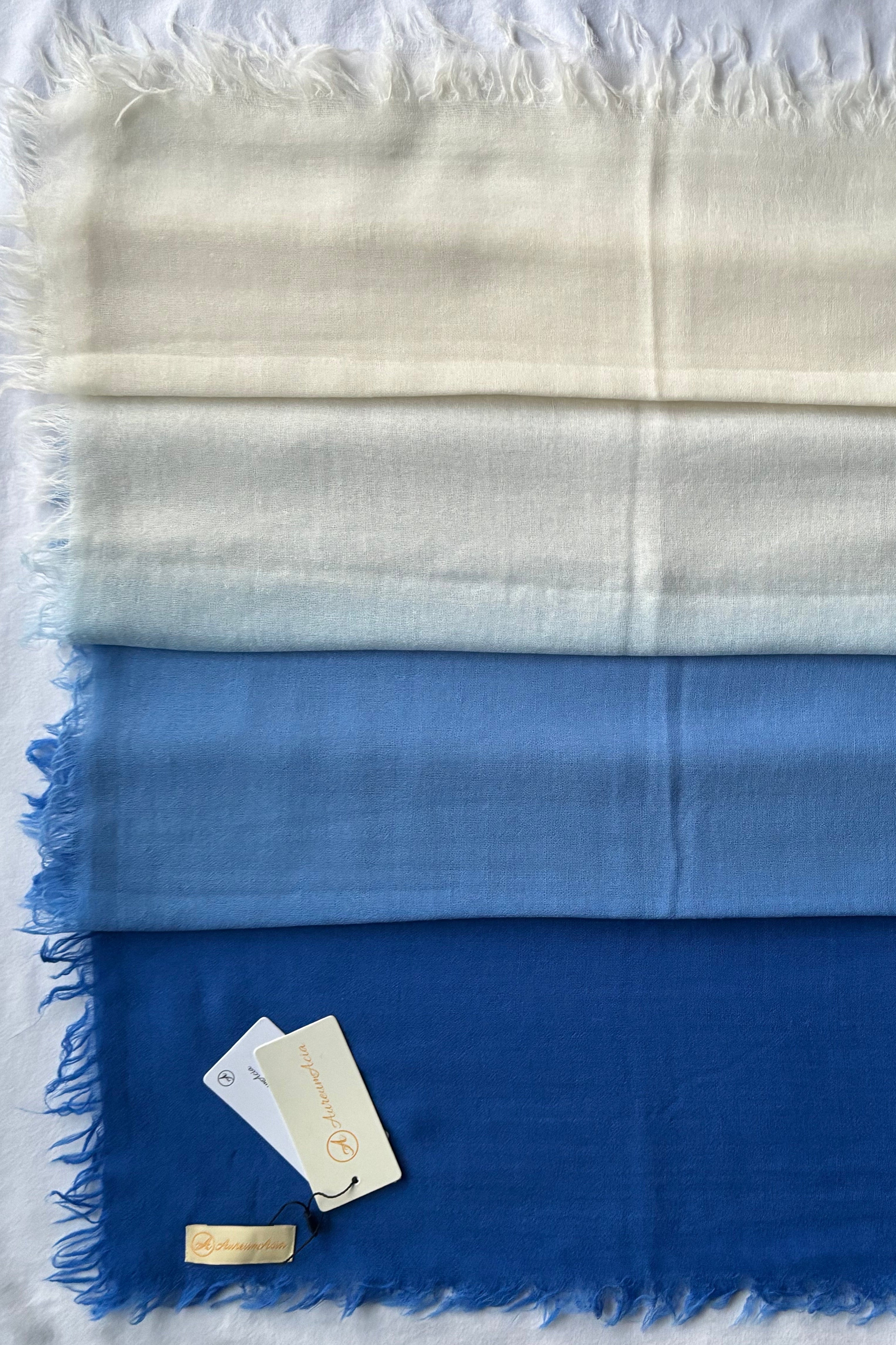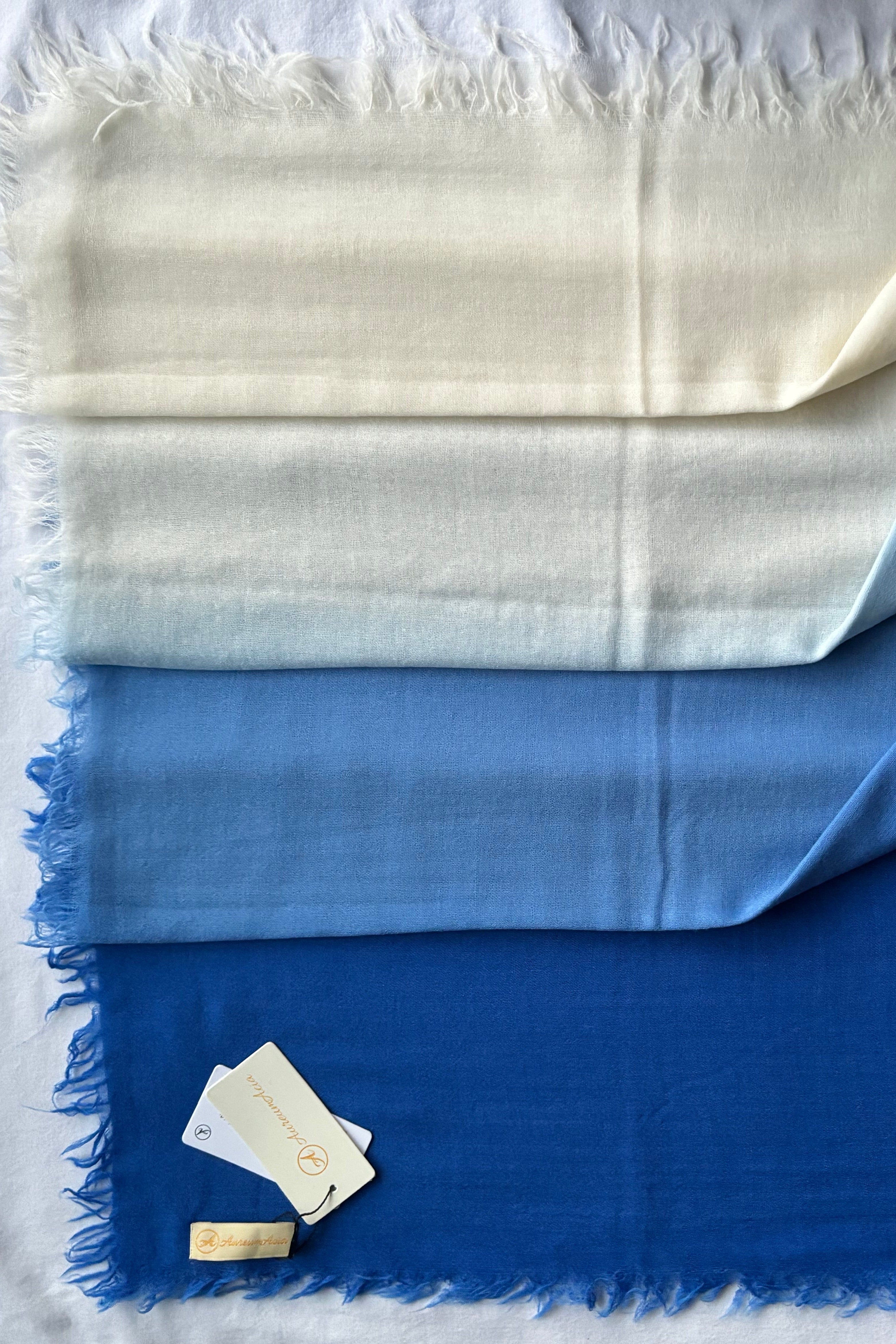 Wrap yourself in the calm of a winter sky with this ombre wool scarf blending deep blue, pure white, and soft sky hues. Crafted from premium fine wool, this piece offers warmth with a soothing colour transition reminiscent of ocean waves, creating a look both elegant and effortlessly modern.