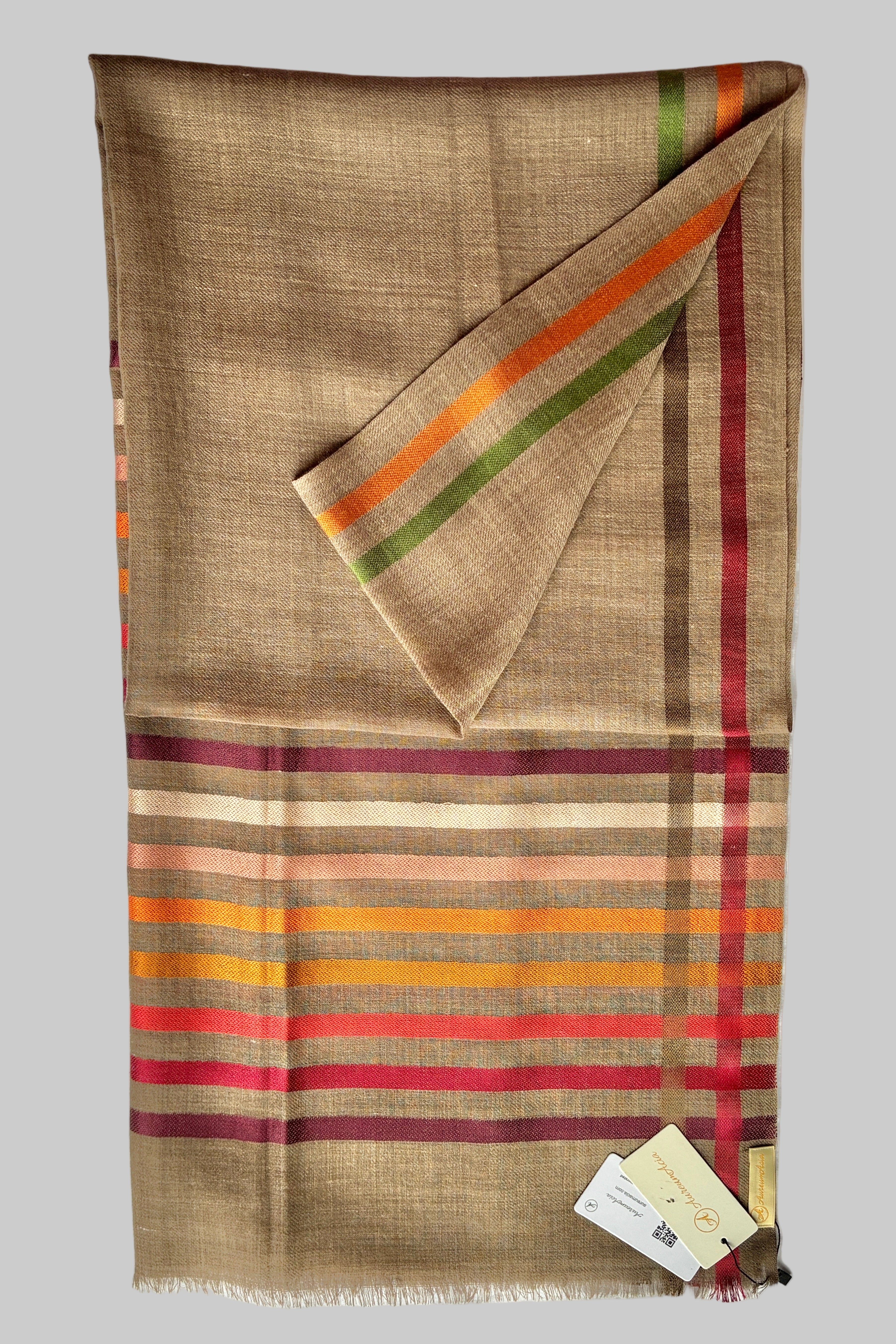 Wrap yourself in the contemporary grace of the rainbow edge scarf—an artisanal accessory crafted with silk on wool. This minimalist scarf dazzles with its serene plain brown center, drawing all eyes to the vivid multicoloured silk stripes near each short ends.
