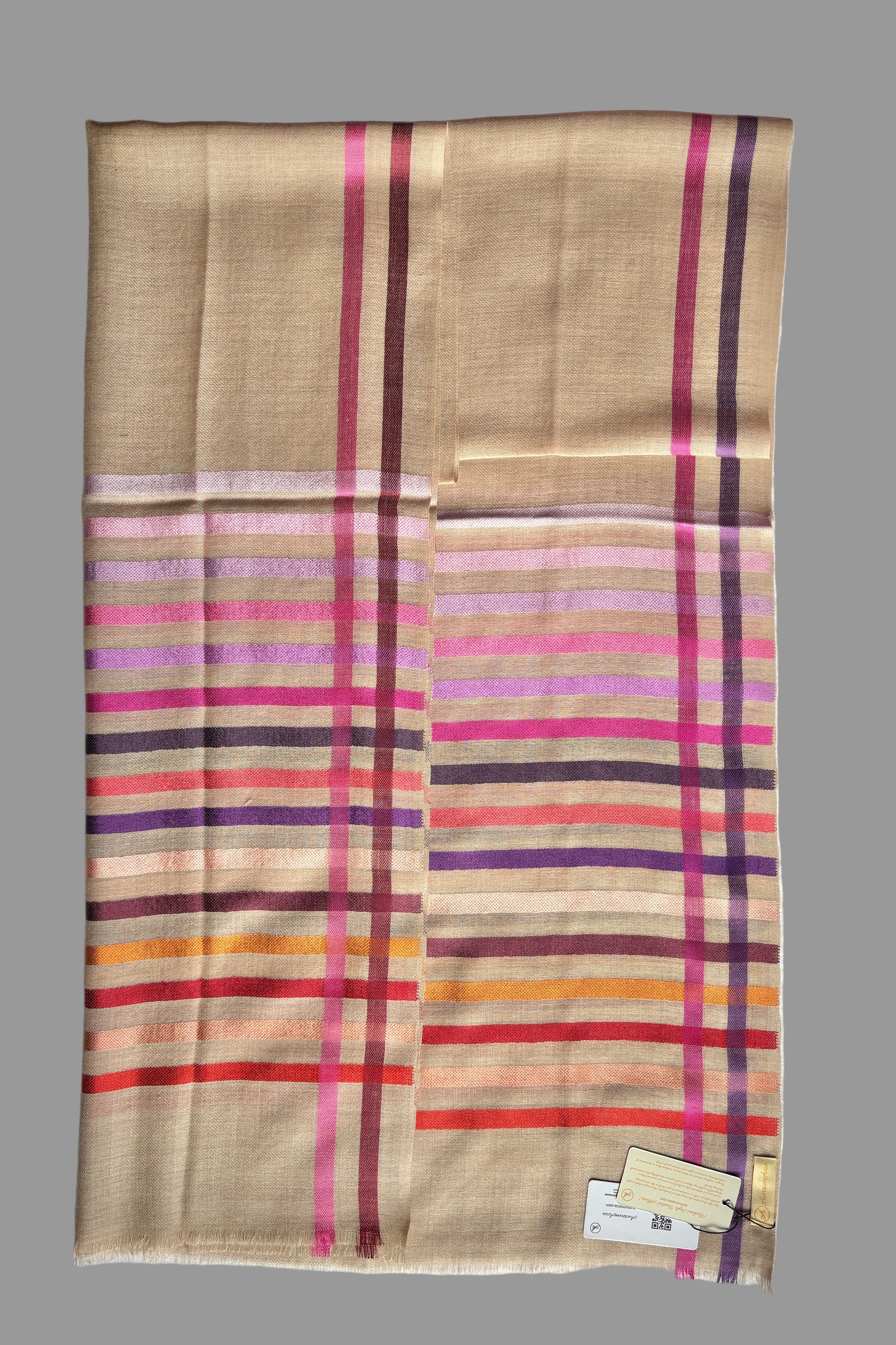 Wrap yourself in the contemporary grace of the rainbow edge scarf—an artisanal accessory crafted with silk on wool. This minimalist scarf dazzles with its serene plain light brown center, drawing all eyes to the vivid multicoloured silk stripes near each short ends.