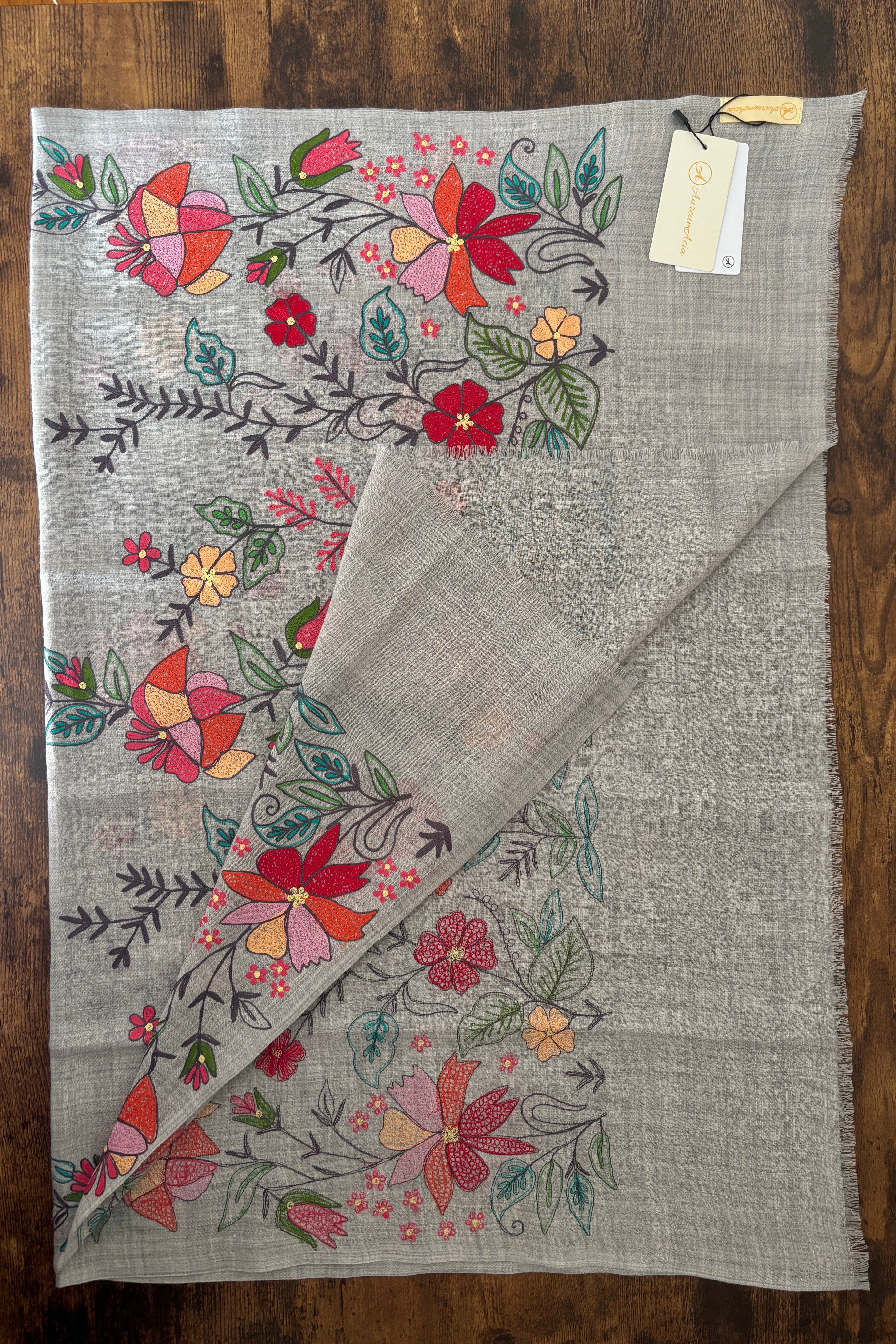Woollen Scarf with Multicolour Silk Embroidery- Light grey