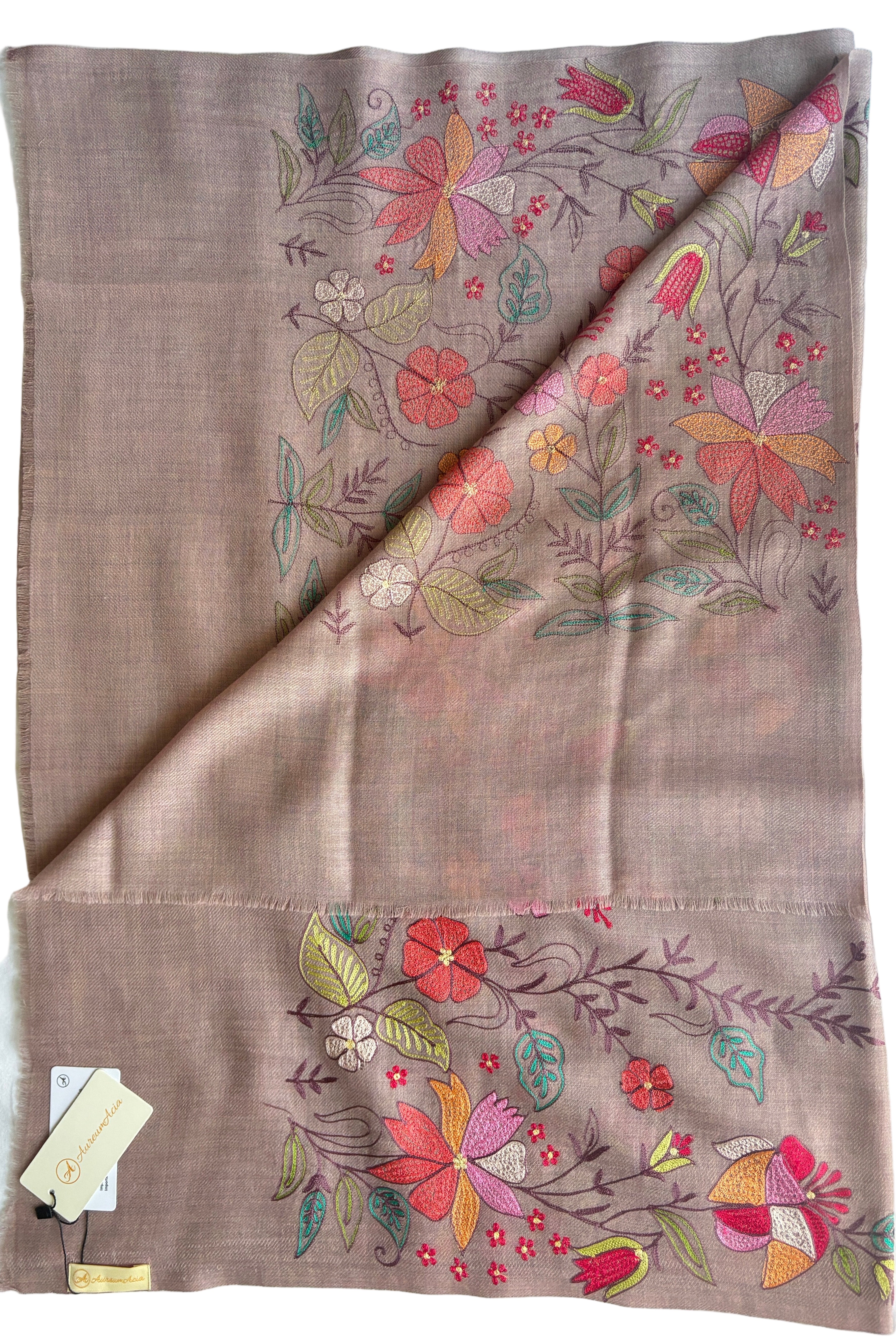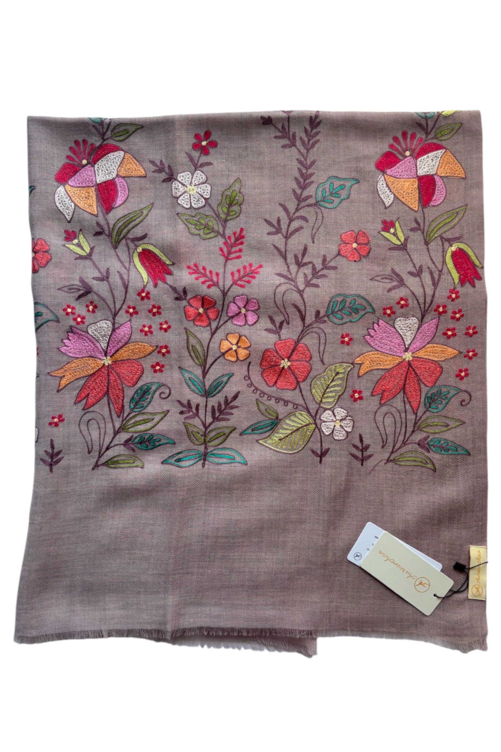 Grace your winter wardrobe with refined elegance. This Light Mauve Wool-Silk Scarf blends warmth and artistry, featuring delicate multicolour silk embroidery in a unique style. The subtle lemon-green tint on the mauve base adds a refreshing tone that illuminates both day and evening looks.